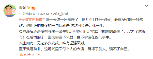 记者袁野也发表感慨:这一天终于还是来了,这几个月对于球员、教练员们是一种煎熬,他们说得最多的一句话就是:这次可能是九死一生。虽然最后还是没有等来一线生机,但他们已经把自己能做的都做了,尽力了就没有什么后悔的了,因为命运本来就一直不掌握在他们手中。人生如此,无论多少变故,唯有坚强面对。至于孰是孰非,这场戏里面每个人的表演,瞒得了别人,骗不了自己。