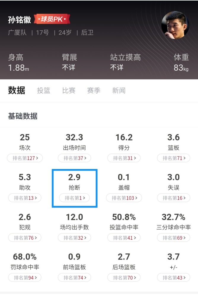 孙铭徽场均16.2分3.6篮板5.3助攻2.9抢断,投篮命中率50.8%,三分球命中率32.7%。数据是非常抢眼的,尤其是在抢断这一项上,在数据榜常年被外援控制的情况下,孙铭徽杀出了一条血路,抢断领衔全联盟,也是英雄本色。