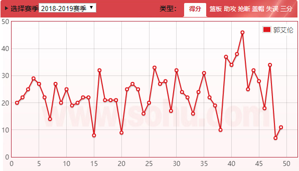 第三:超强的得分能力,郭艾伦的得分能力后卫之中无人能及。郭艾伦进攻无死角,凭借超快的速度和控球技术结合,突破如入无人之境,是现役本土后卫中的佼佼者。2019-20赛季没打完,我们看下2018-19赛季郭艾伦单场数据: