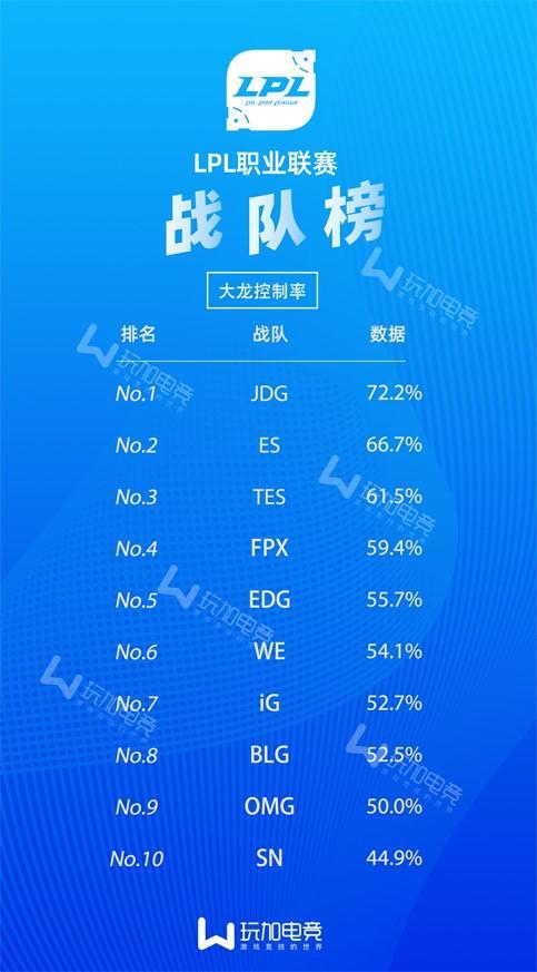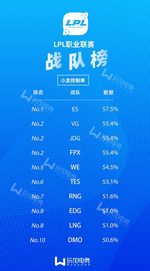 在小龙控制率榜上,新军ES排名第一,VG、JDG和FPX以55.4%的数据并列第二,前十的队伍小龙控制率都超过了50%。