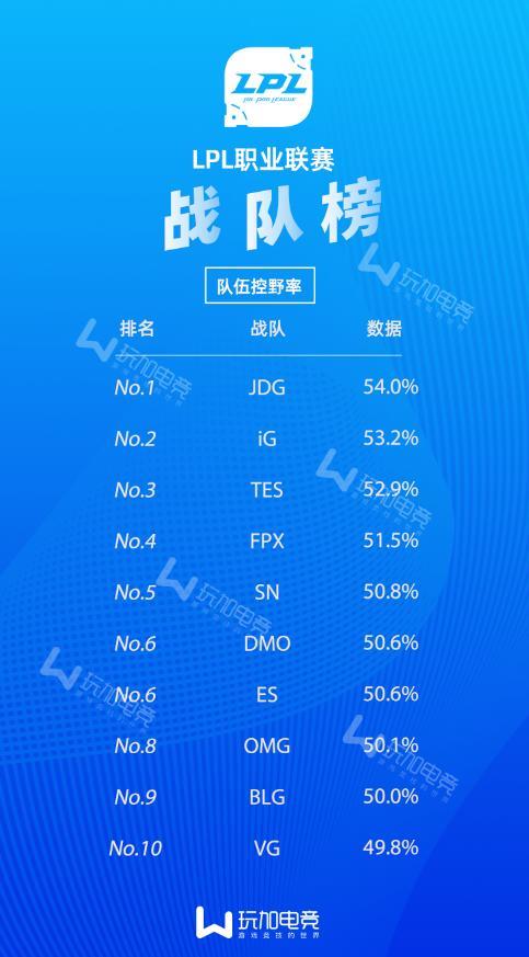 队伍控野率榜上,JDG也拿下了榜首。紧随其后的是iG和TES。