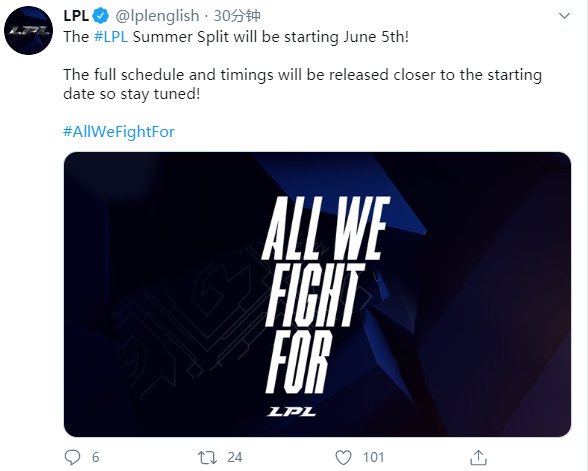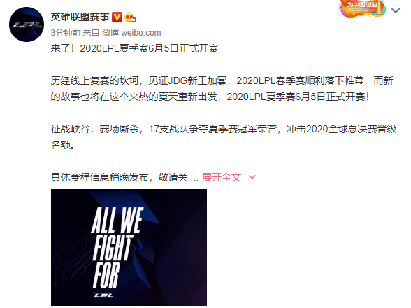 在5月12日,我们终于迎来了LPL夏季赛开赛时间的官宣。最先官宣这个消息的是LPL的官推,官推表示“LPL夏季赛将会在6月5日回归。”在LPL官推官宣后不久,英雄联盟赛事官博紧跟着官宣确认了这个消息: