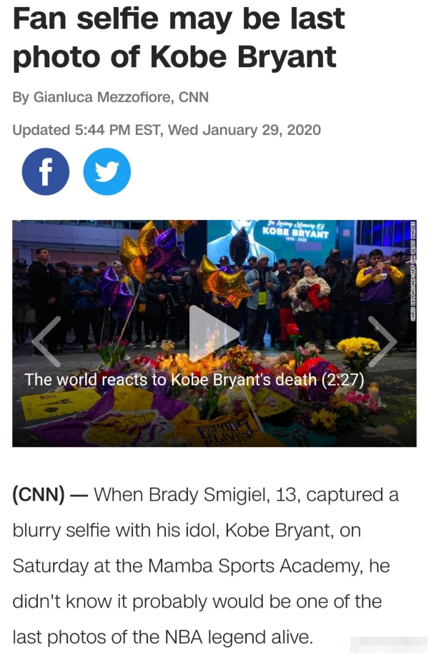 但是,小男孩再也没有等到与科比合影的机会,他也不会想到,NBA传奇巨星生前的最后一张照片,或许就在他的手机之中。小男孩一家周日起床时,听说卡拉巴萨斯市发生了一起直升机坠机事故,当时他们只是为直升机中的乘客祈祷。