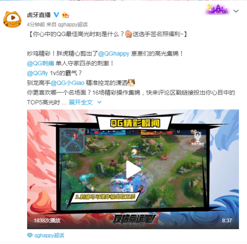 虎牙直播在此次活动中精心挑选了重庆QGhappy在之前KPL常规赛中的16个高光瞬间,而且网友们只要参与投票活动就有机会获得重庆QG战队Fly和Hurt选手的签名照。活动期间大量玩家与粉丝踊跃参与,高光榜最终竞争也是格外激烈。