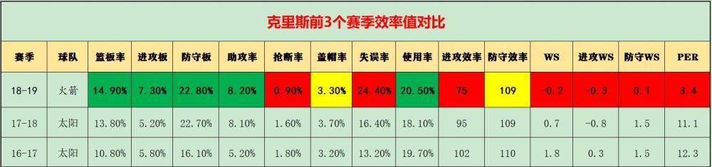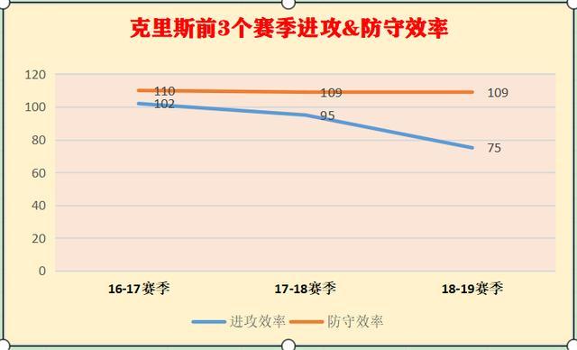 第二,攻防效率。虽然出场时间不同,但是换算成进阶数据,还是具有一定的参考价值的。克里斯的篮板率稳中有升,但是抢断率和失误率下滑很大,盖帽率基本维持原有的水平。在攻防两端的总体效率上,克里斯更是出现了较大幅度的波动。特别是进攻端方面,从102下滑至75,简直是惨不忍睹。
