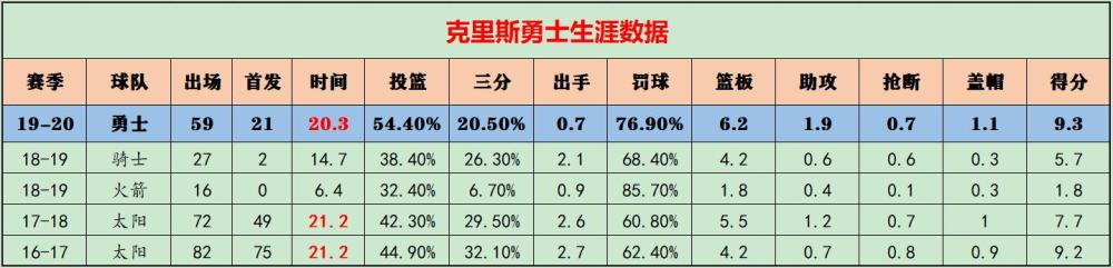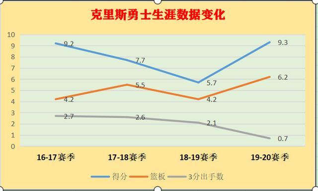 第二,角色定位。在太阳、火箭和骑士时期,克里斯的位置都是大前锋。但是来到勇士之后,他就彻底成为一名中锋。在3秒区,他完全可以发挥自己的弹跳优势,篮板、盖帽和协防。从数据上看,这个赛季的篮板数、得分、盖帽数,都有了较大幅度上涨。