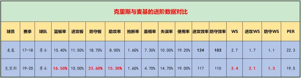 在防守端,两个人的防守数据也基本上是旗鼓相当。我们同样选取了19-20赛季的克里斯,17-18赛季的麦基的数据进行对比。其中, 篮板率和防守篮板率上,克里斯甚至是优于麦基的。助攻率上,克里斯以15.3%比8%,处于压倒性优势,这方面就能够看出两个人的天赋差距。抢断率两个人持平,盖帽率麦基的经验更加丰富,对于时机的把握更加精准。防守效率值上,麦基要优于克里斯,但是在防守胜利贡献值上,克里斯又要更胜一筹。综合效率值,两个人也差距不大,相信通过一个赛季的磨合,克里斯与库里、汤普森和格林之间,也会产生更好的默契。