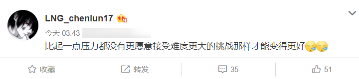 下面就是LNG替补上单chenlun的发文,他发了条非常励志的动态:比起一点压力都没有,更愿意接受难度更大的挑战,那样才能变得更好!