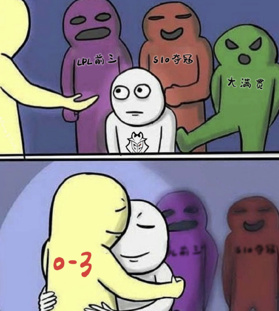 从图上可以看出左边围在一起讨论悄悄话的人群就代表着LPL的战队,右边孤零零坐着的人就代表G2。中间竖着的牌子上写着LPL夏季赛和S10上海,也就是2020年的两场重磅比赛,S10上海自然就是在上海举行的英雄联盟S10全球总决赛了!不止这张图,G2还配了文字,让这位“官方宝宝”的心思一目了然。