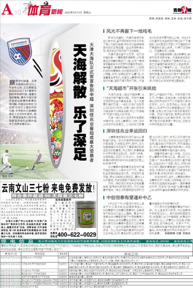 据新华社报道,天津天海俱乐部12日上午发布公告,正式解散这支仅仅征战了三个赛季中超的年轻俱乐部。随着天海的解散,事关中国足球三级职业联赛的参赛名单问题,中国足协也将在13日至15日于上海召开的中超、中甲和中乙联赛联席会上正式对外宣布。其中,青岛球迷关心的中创恒泰是否有机会替补进中乙也将水落石出。