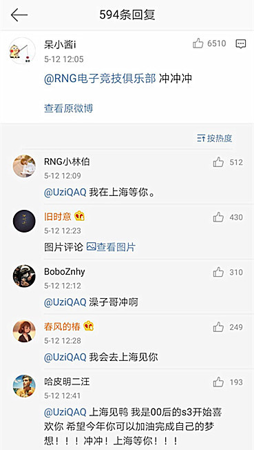 小编翻了一下评论,还好还好,虽然成绩不行了,热度还没有降得太快,前五个里还能看到支持RNG的身影。只是,点开评论才发现,这里边超过八成的人在@枣子哥,希望能够今年在上海见到枣子哥。但是,枣子哥至今还没有官宣回来啊!