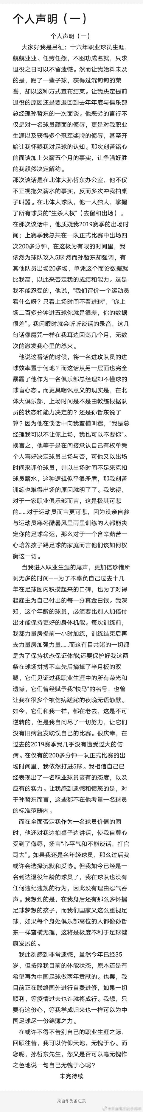 在吕征的个人声明中,吕征无奈宣布退役:踢了一辈子球,获得过沉甸甸的荣誉,却以这种方式宣布退役。吕征的退役宣言,充满了遗憾,他将矛头直指北体大总经理孙哲东。