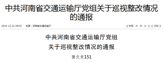 上述通报介绍,根据河南省委巡视工作统一部署,2019年4月10日至6月10日,省委第一巡视组对省交通运输厅进行了巡视。2019年8月27日,省委第一巡视组向省交通运输厅党组反馈了巡视意见。