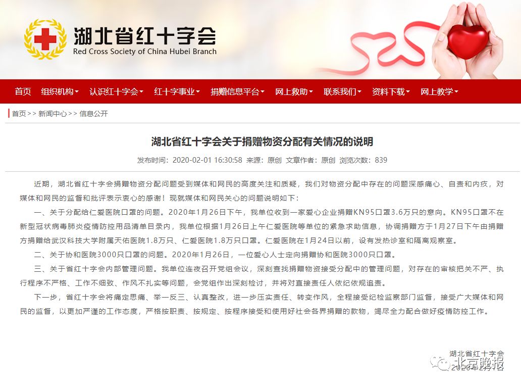 刚刚,湖北省红十字会就捐赠物资分配问题发布情况说明——
