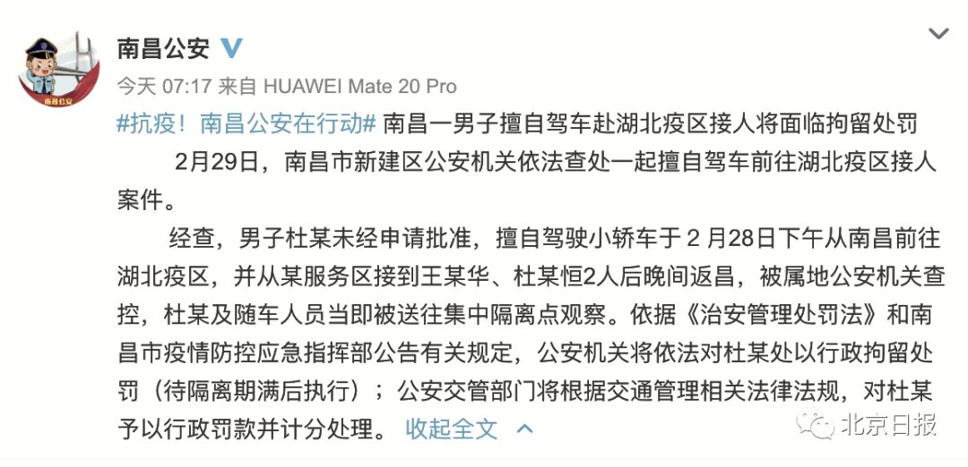 据@南昌公安 消息,2月29日,南昌市新建区公安机关依法查处一起擅自驾车前往湖北重点防疫地区接人案件。