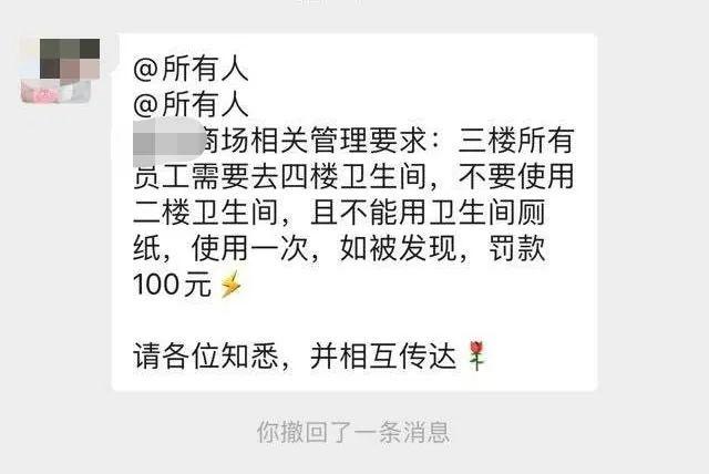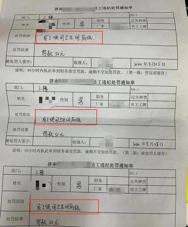 5月7日,微博上一名网友发帖吐槽,说自己是一家商场的员工,在使用了商场内公厕的厕纸被发现后,竟收到了50元的处罚通知单。