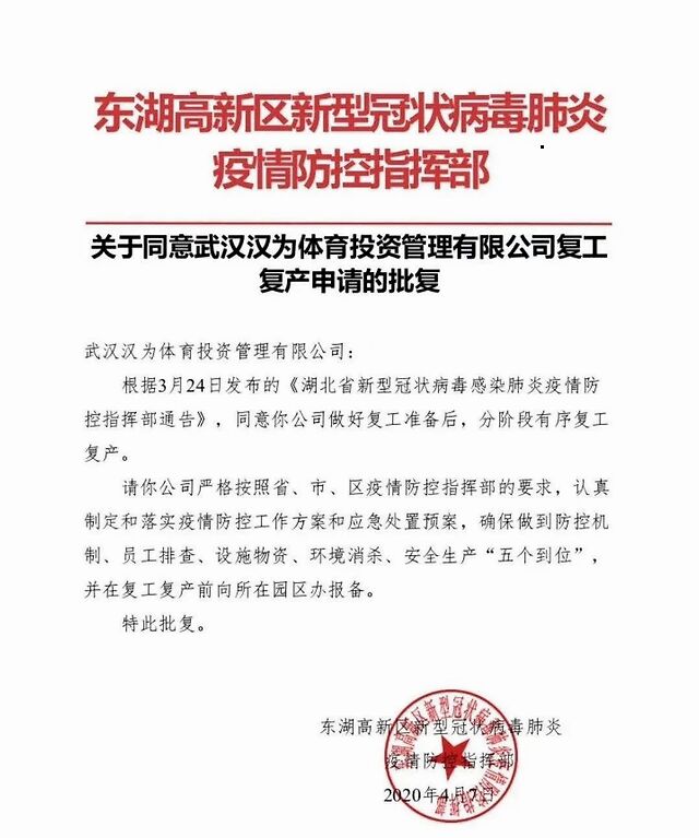 武汉知名本土体育企业汉为体育复工