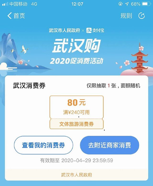 4月19日中午12时整,武汉市面向全体在汉人员投放消费券首轮领取活动正式开启。据了解,从4月19日起至7月31日,武汉市将在为期三个多月的时间里累计投放5亿元“武汉消费券”,在汉人员可登录支付宝、美团点评、微信小程序等参与领券,以后投放活动将固定在每周四中午12点。在武汉市财政拿出5亿元资金的同时,阿里巴巴、美团和腾讯三家平台也匹配了总价值约18亿元的平台、机构和商户消费券参与活动。也就是说,将有23亿元的消费券投向武汉市场,用以活跃消费市场刺激经济复苏。