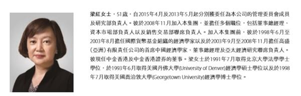 身份。2015年4月,梁红即已被委任为中金公司管理委员会成员,在年报“出场”顺序中排名位于前列。