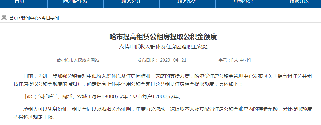 原标题:哈尔滨提高租赁公租房提取公积金的额度 市区每户每年可提取18000元