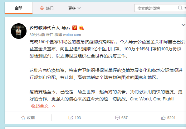 马云疫情给中国捐款了吗 据凤凰网科技了解,这...