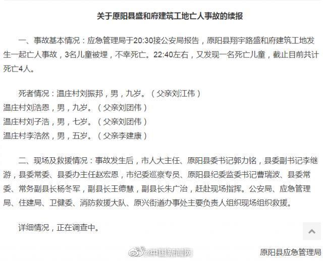 4月19日,河南省新乡市原阳县委宣传部通报,4月18日,河南省原阳县盛和府小区堆放的土方中陆续发现4名5至11岁儿童尸体,均系与该小区相邻的原阳县原兴办事处温庄村人。经初步判断,可能因土方压埋窒息死亡。