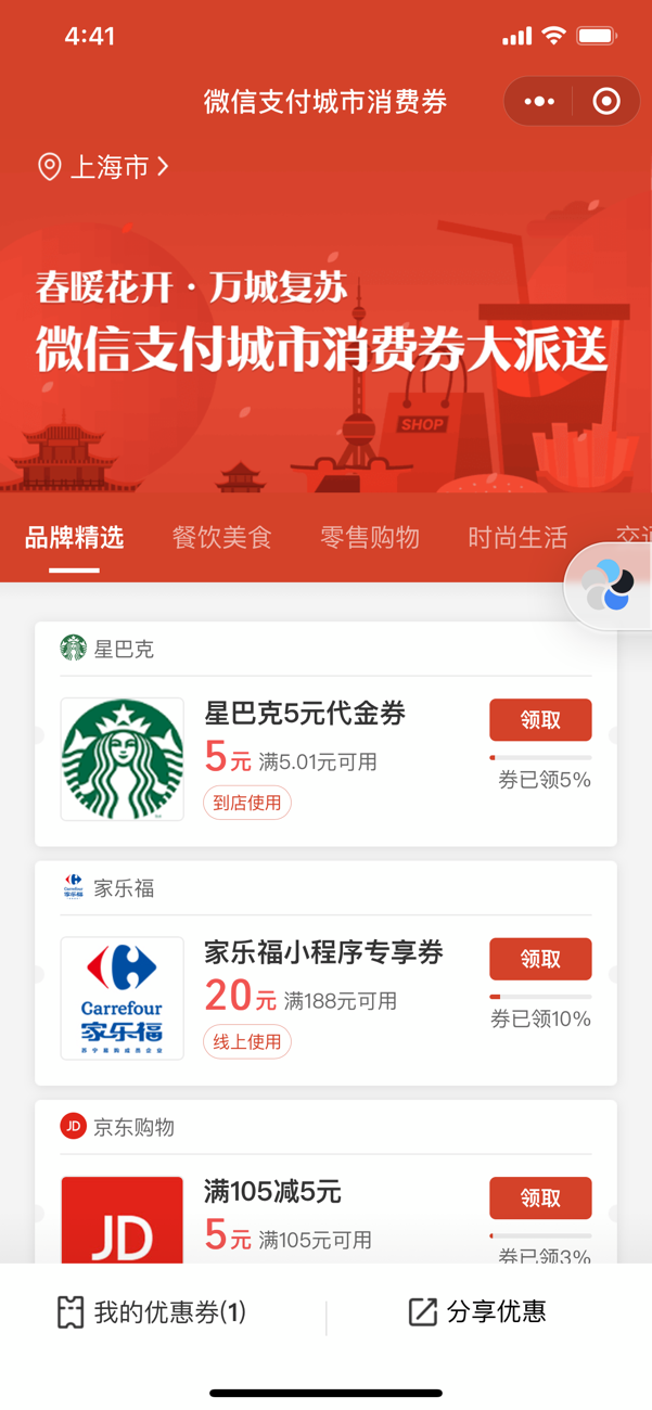 据微信方面介绍,在“五五购物节”期间,上海市民可以通过“微信支付城市消费券”小程序,领取商户消费券,其中包括星巴克、来伊份、家乐福等知名品牌商家,涵盖餐饮、零售、时尚、交通、母婴药店、酒旅等多个行业,还包括线上电商和银行机构等。