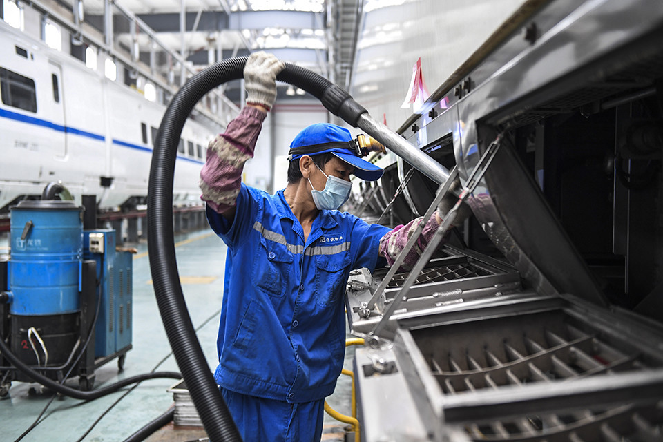 2020年4月,广西南宁动车所检修库里,工作人员正在对车辆的空调通风系统进行清洁。 (新华社/图)