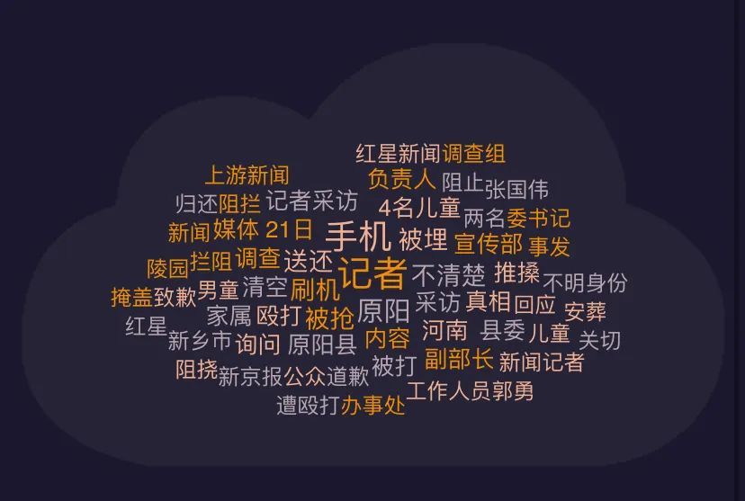 关键词云中,“记者”“手机”“原阳”是被提及频次最高的词汇,其中“新京报”“红星新闻”等涉事媒体被广泛关注,“推搡”“殴打”“刷机”等词语也成为网友关注的重点。