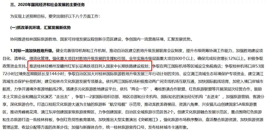 报告将推进桂林经郴州至赣州红军长征高铁项目列入国家中长期铁路建设规划,列入了桂林市2020年国民经济和社会发展的主要任务中。