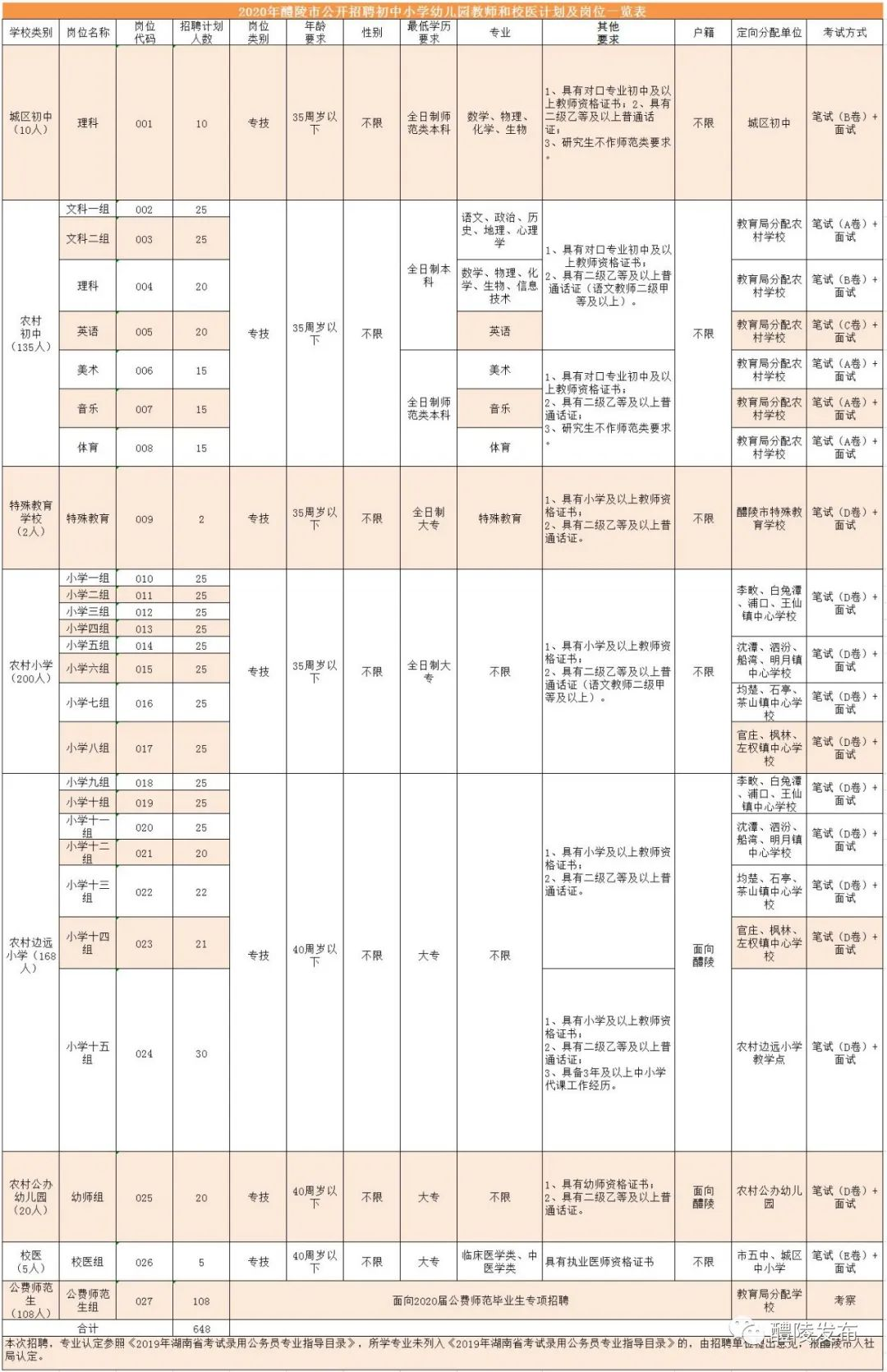 株洲醴陵市人力资源和社会保障局、教育局发布了《2020年醴陵市公开招聘初中小学幼儿园教师和校医公告》,公开招聘事业编制初中小学幼儿园教师和校医共648名。