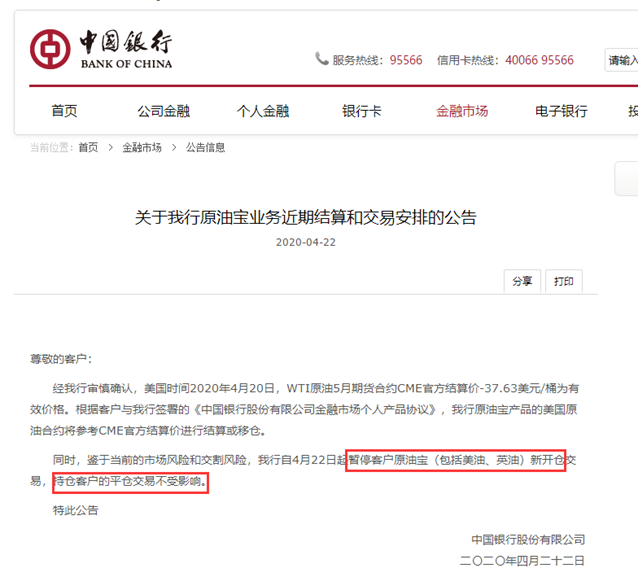 中国银行同时表示,鉴于当前的市场风险和交割风险,该行自4月22日起暂停客户原油宝(包括美油、英油)新开仓交易,持仓客户的平仓交易不受影响。