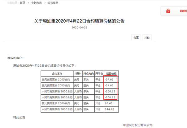 中国银行同日发布另一则公告,该行原油宝“美元美国原油 2005合约”4月22日平仓结算价格为-37.63美元,“人民币美国原油 2005合约” 4月22日平仓结算价格为-266.12元人民币,已无新开仓结算价。