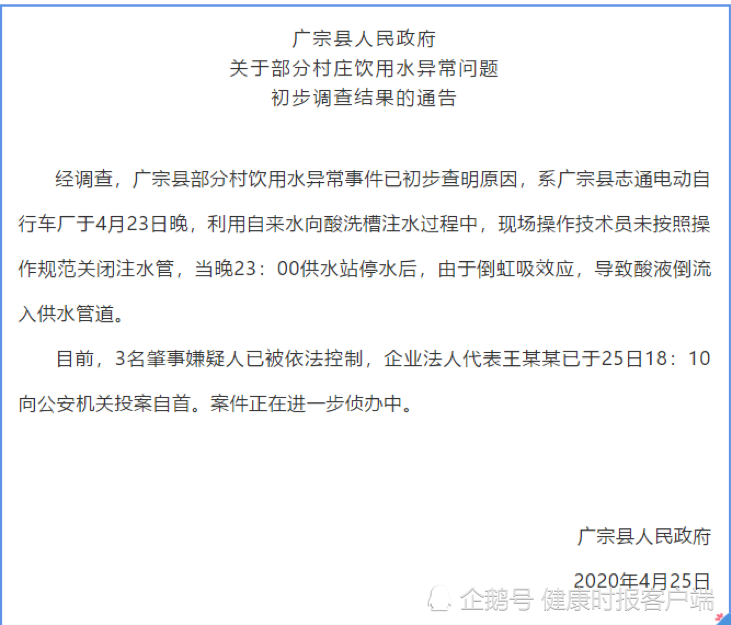 通告称,经调查,广宗县部分村饮用水异常事件已初步查明原因,系广宗县志通电动自行车厂于4月23日晚,利用自来水向酸洗槽注水过程中,现场操作技术员未按照操作规范关闭注水管,当晚23:00供水站停水后,由于倒虹吸效应,导致酸液倒流入供水管道。