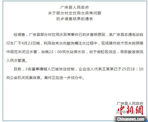 中新网邢台4月25日电 (张鹏翔 李铁锤)针对广宗县广宗镇部分村庄饮用水异常一事,河北省广宗县宣传部微信公众号“广宗发布”25日晚间通报称,经查,事故原因系广宗县志通电动自行车厂技术人员违规操作,未关闭水管,由于晚间停水,水管产生倒虹吸效应,导致酸液倒流入供水管道。目前,3名肇事嫌疑人已被依法控制,企业法人代表王某某已向公安机关投案自首,案件正在进一步侦办中。