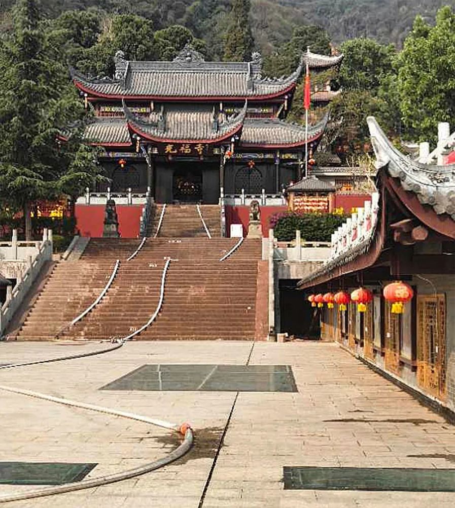 据现场消防人员介绍,当时火线距光福寺大殿有400余米的距离,四川消防救援总队迅速调集人员,现场划定安全距离,实地测试射水距离,对地表、植被、树木和建筑等充分加湿,延缓火线的蔓延和影响。同时,现场布置了3道防线,调动消防远程供水系统,接通了寺庙内12处消防供水通道,多辆消防车及市政供水车在现场值守,时刻关注着火情进展。在坚守火线的同时,前方指挥部将人员、车辆全部布置上阵,部署了40余个水炮、水枪阵地,在凉山彝族奴隶社会博物馆至光福寺山门沿线,调集5辆多功能抑尘车、7辆洒水车持续不断地向林区喷水,对重点单位、部位实施保护,阻止逼近光福寺围墙的大火。