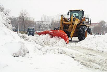 21日上午,齐齐哈尔市区街路上清雪车正干得热火朝天,清雪车、大型雪铲、大型翻斗车齐上阵,路面积雪瞬时被推至路边。