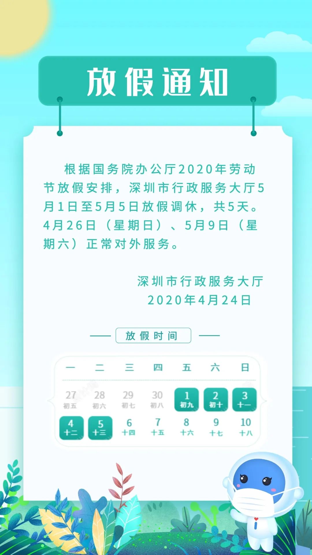 根据国务院办公厅2020年劳动节放假安排,深圳市行政服务大厅5月1日至5月5日放假调休,共5天。
