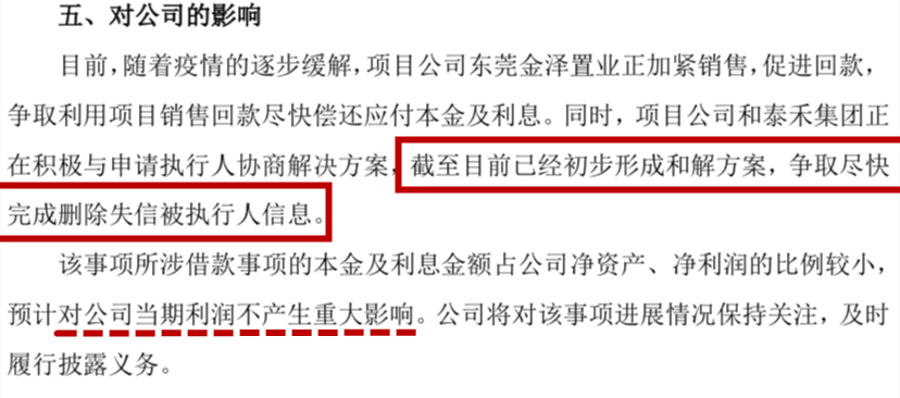 对此,泰禾集团于4月26日发布公告表示:由于为项目公司东莞金泽置业债务提供担保承担连带责任而被列为失信被执行人。目前正在积极与申请执行人协商解决方案,已经初步形成和解方案,预计很快解决。