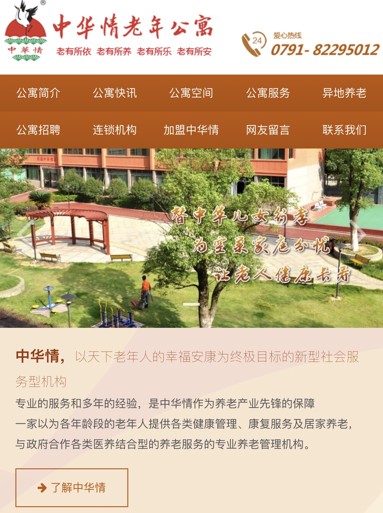 根据中华情老年公寓的官网简介,该老年公寓为各年龄段的老年人提供各类健康管理、康复服务及居家养老,与政府合作各类医养结合型的养老服务,是专业的养老管理机构。曾获"江西省诚信承诺先进单位"、"全国爱老敬老先进单位"、"全国百家杰出养老服务机构"、"全国首批异地养老定点单位"和"全国养老服务机构标准化建设试点单位"等荣誉。