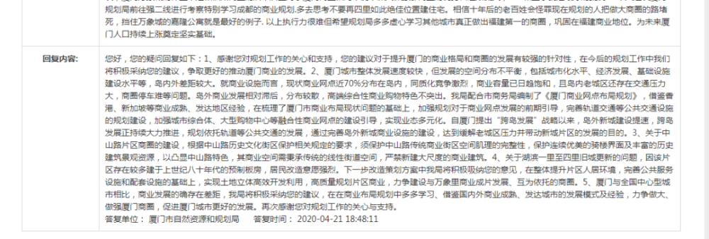 1、感谢您对规划工作的关心和支持,您的建议对于提升厦门的商业格局和商圈的发展有较强的针对性,在今后的规划工作中我们将积极采纳您的建议,争取更好的推动厦门商业的发展。