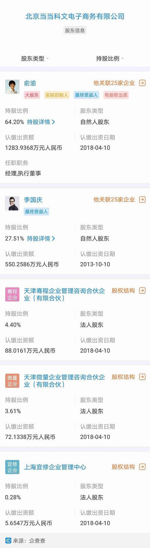 (北京当当科文电子商务有限公司股权结构,图片来源:企查查)
