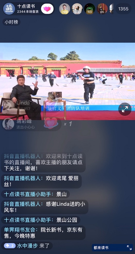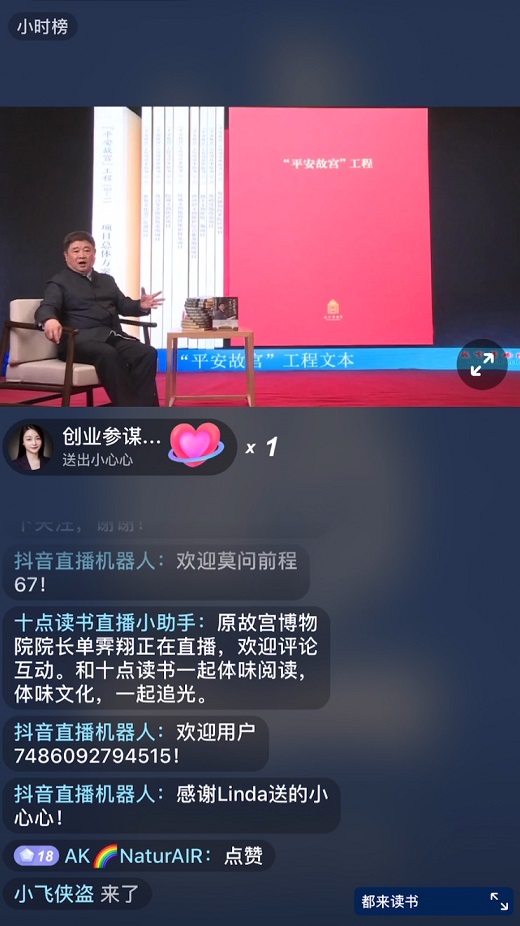 近日,在抖音直播发起的都来读书领读人直播读书主题直播活动中,央视新闻等多家媒体、多位高校新闻学院的教授,众多作家学者、演艺明星等齐聚抖音开播,带领全民在抖音读书。单霁翔也带着自己的新书《我是故宫看门人》现身抖音直播间,在线领读,分享在故宫工作的故事。