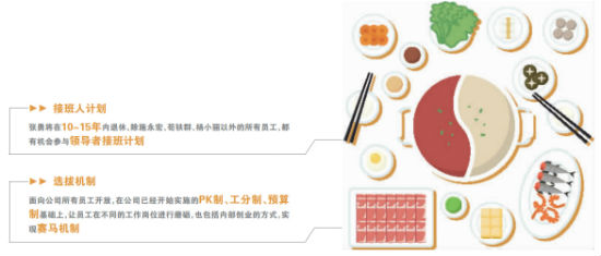 在接班人选拔机制方面,海底捞方面透露,选拔机制面向公司所有员工开放,在公司已经开始实施的PK制、工分制、预算制基础上,让员工在不同的工作岗位进行磨砺,也包括内部创业的方式,实现赛马机制。