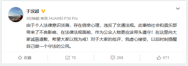 15天的行政拘留29日期满,于汉超第一时间通过个人微博对外道歉:“由于个人法律意识淡薄,存在侥幸心理,违反了交通法规。此事给社会和俱乐部带来了不良影响,在法律法规面前,作为公众人物更应该带头遵守!在这里向大家诚恳道歉,希望大家以我为戒!对于大家的批评,我虚心接受,以后时刻提醒自己做一个守法的公民。”