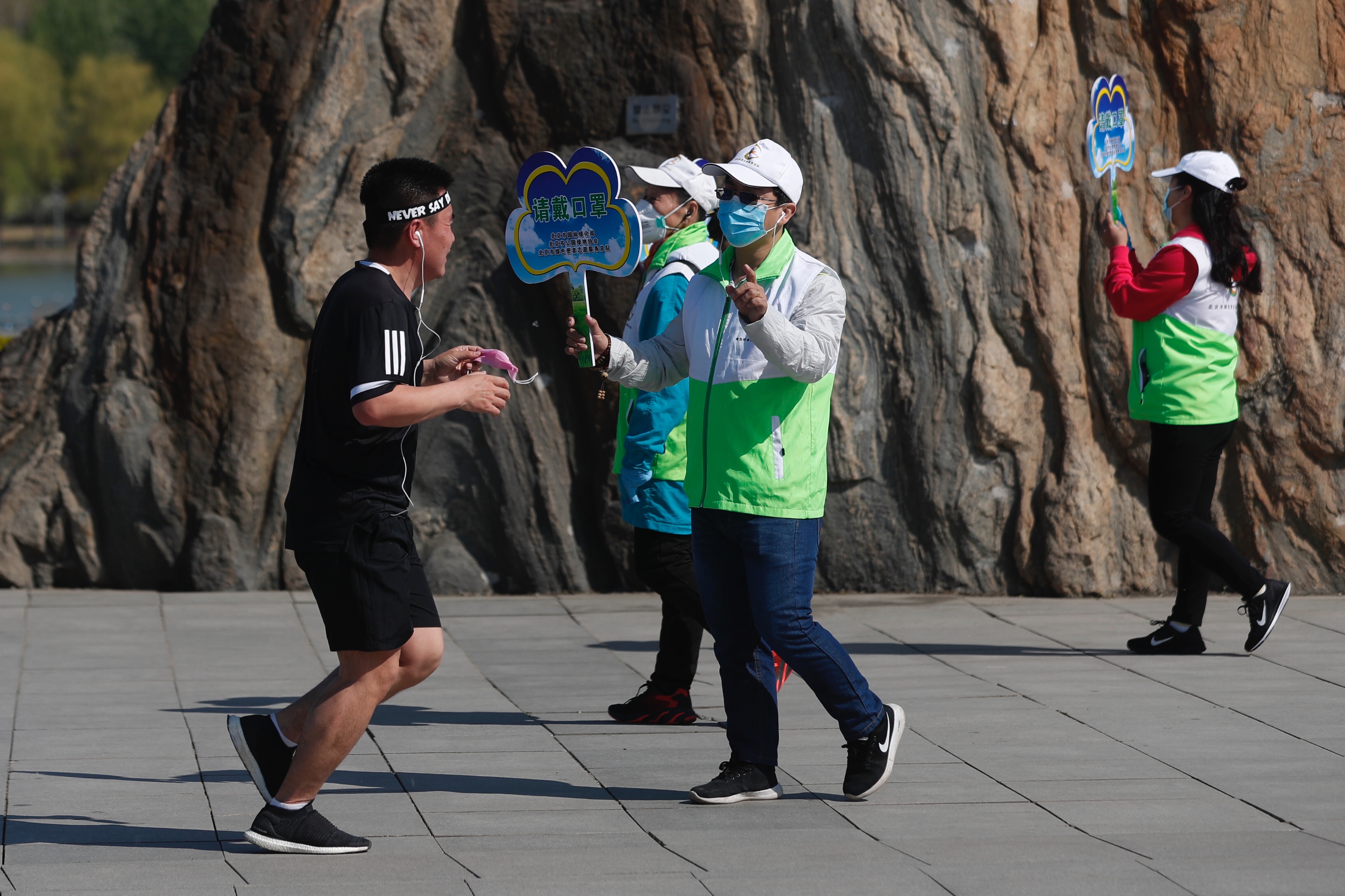 志愿者提醒在园内健身的市民戴好口罩。摄影/新京报记者 侯少卿