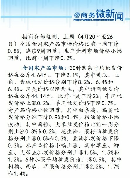 据商务部发布的数据,全国农产品市场价格连续9周回落,上周(4月20日至26日)全国食用农产品市场价格比前一周下降0.8%;生产资料市场价格小幅回落,比前一周下降0.2%。