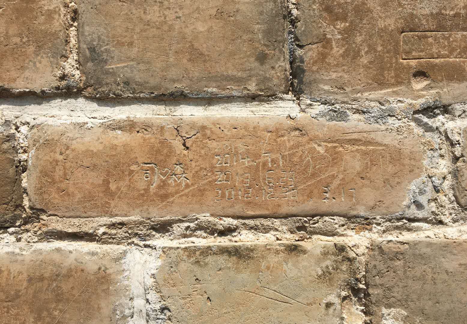 游客留下的刻字时间包含1958年4月20日、1977年6月5日、1980年8月16日、2009年1月等。新京报记者发现,墙砖上的刻字,大多是2010年之前刻的,2010年之后刻的较少。其中一些被刻画的墙砖经历长期风化,刻的字已经淡去看不清楚,但痕迹仍可见。