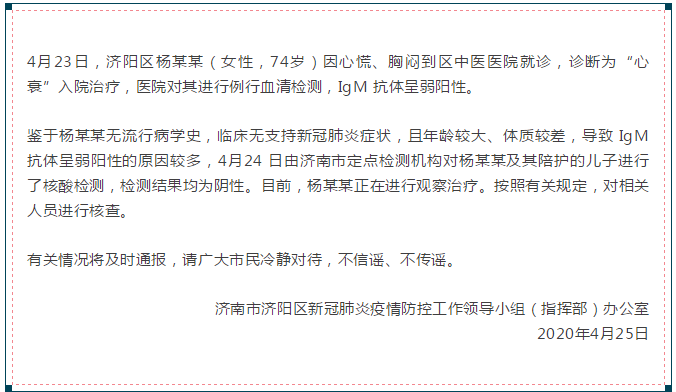 据济南市济阳区新冠肺炎疫情防控工作领导小组(指挥部)办公室通告,4月23日,济阳区杨某某(女性,74岁)因心慌、胸闷到区中医医院就诊,诊断为“心衰”入院治疗,医院对其进行例行血清检测,IgM抗体呈弱阳性。鉴于杨某某无流行病学史,临床无支持新冠肺炎症状,且年龄较大、体质较差,导致IgM抗体呈弱阳性的原因较多,4月24日由济南市定点检测机构对杨某某及其陪护的儿子进行了核酸检测,检测结果均为阴性。目前,杨某某正在进行观察治疗。按照有关规定,对相关人员进行核查。有关情况将及时通报,请广大市民冷静对待,不信谣、不传谣。