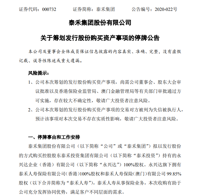 4月28日,泰禾集团(000732)发布停牌公告,拟定以发行股份的方式购买控股股东泰禾投资所间接持有的保险业务相关资产,自2020年4月28日上午开市起停牌。